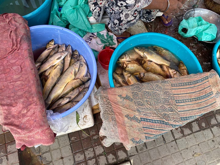 Later that afternoon, Isobel and I go to the Sunday market. We walk a two kilometre stretch of vendor stalls starting in Lal Chowk, the downtown centre square of Srinagar. The market continues along a bridge across the Jhelum river. Women in head scarves sit periodically spaced along the bridge, surrounded by bowls filled with fish. I recognise the small Kashmiri fish from earlier alongside quite a few other varieties and sizes of fish.