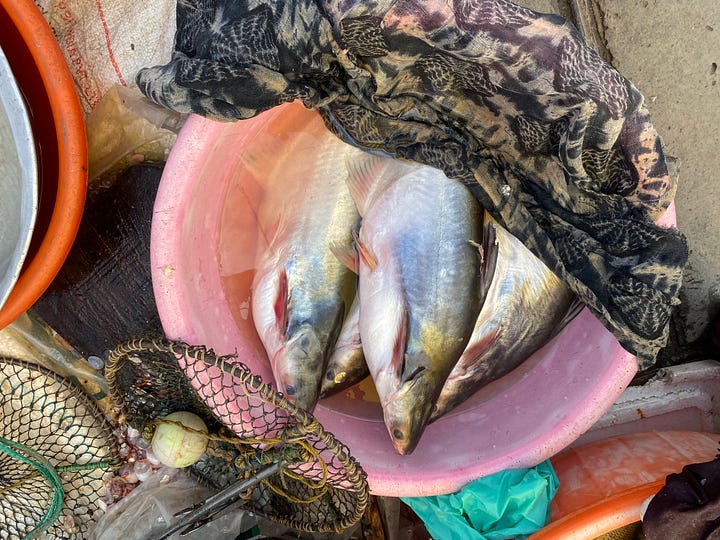 Reaching through the bridge railing, the woman whose wares we are inspecting starts hauling on a long rope, bringing a bucket of water up from the river below. She pours the fresh water between the bowls and I realise these fish are breathing and still alive.